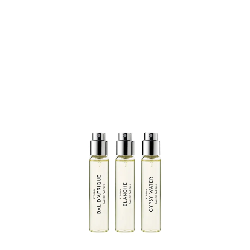Byredo La Selection Nomade is a citrus kit for men. La Sélection Nomade is a presentation box of three BYREDO iconic scents: Bal d’Afrique, Blanche and Gypsy Water, housed in 12ml vials, ideal to use with BYREDO’s functional and timeless ‘Nécessaire de Voyage” leather travel cases.