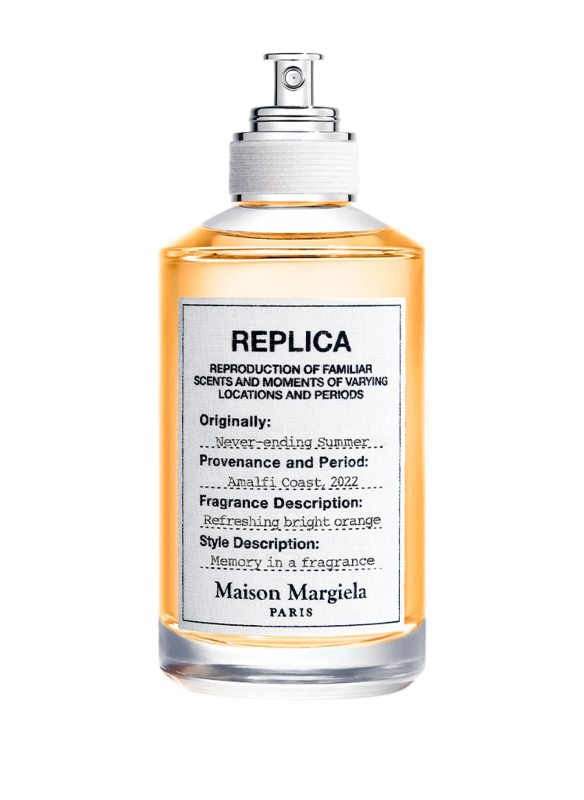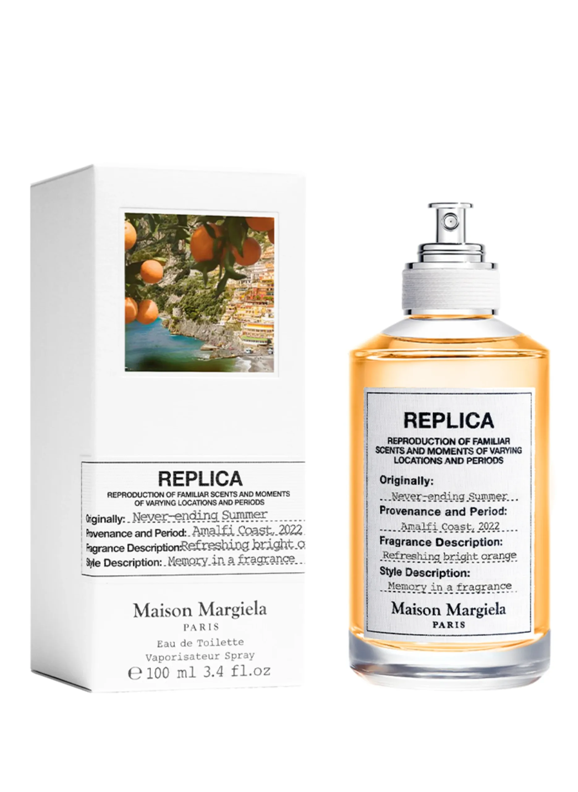 A fragrance that transports you to an eternal summer on the Amalfi Coast and captures the uplifting essence of this region. Never-ending Summer Eau de Toilette, a spicy citrus fragrance that captures the mood of a lively summer. In creating Never-ending Summer, perfumer Christophe Raynaud has captured the essence of an endless Italian vacation. The sophisticated fragrance creation Never-ending Summer captures the mood of an unforgettable vacation on the Amalfi Coast with its refreshing citrus notes and the unmistakable scent of an Italian spritz. Never-ending Summer is based on Maison Margiela Fragrances’ unique Italian spritz accord, a signature cocktail that is instantly recognizable for its invigorating citrus notes. The Spritz accord combines with bitter orange, whose tangy, invigorating scent is reminiscent of a freshly peeled orange, and the vibrancy of vetiver, whose sensuality reflects the earthiness of Italy.